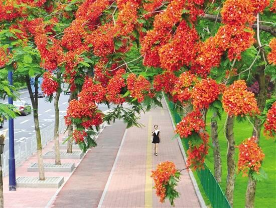 在行道树方面,广州市继续推广和种植新树种。除了常规树种,还不断引进外来新优植物,广东省林业科学院院长、广东花卉协会会长李小川提到从澳大利亚引进的澳洲火焰木,因抗病性强、树形优美,开花时宛如一朵朵盛开的火把,近年也成为了城市绿化用树。行道树的数量不断被刷新和接棒,成为名副其实的花城新名片。