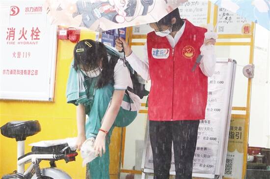 当天,广州天降大雨。身穿红色志愿马甲的二局青年,为陆续步入考场的考生们加油打气。“这位同学,感觉考得怎么样呀?来,我这里有防水鞋套,快穿上,别把鞋弄湿了,我来帮你打伞。”志愿者李珮琳对一名刚考完的考生说道。“谢谢姐姐的鞋套,我上午考得还可以,下午继续保持。”考生笑着对志愿者道谢。