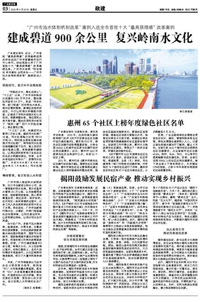 广东建设报讯 记者唐培峰报道:近期,在答复揭阳市政协委员有关扶持揭阳市民宿产业发展的建议中,揭阳市文化广电旅游体育局表示,该局高度重视旅游民宿发展,“规范建设乡村民宿”已列入《关于做好2022年全面推进乡村振兴重点工作的实施方案》,作为推动乡村产业发展的举措之一。今年7月,印发了《揭阳市文化广电旅游体育局关于服务美丽圩镇建设助力乡村振兴三年行动方案》,明确提出“支持乡村民宿发展,加大乡村民宿培育和招商引资力度,开展民宿主题宣传推介,推动乡村旅游民宿业发展”等措施。