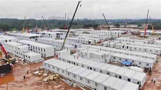 广州(清远)健康驿站项目位于清远市石角镇,占地约956亩。自11月21日起,现场持续多日降雨,建设各方主体克服了地质条件复杂、设备和工人短缺、连续下雨增加施工难度等重重困难,在斜风细雨中,一座座板房如雨后春笋般涌现。