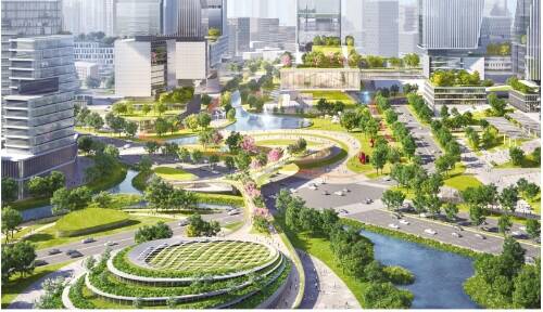 延续“一口通商”时期历史水网格局,传承自然水系脉络,依托黄埔涌及沿岸历史文化场所,打造古今交融的城市主街;保持与黄埔涌、万亩果园湿地的生态联系,构建“蓝绿交织”的生态格局;通过高品质的水岸空间、生态空间及宜人的风环境营造,实现城市与生态的紧密交融。