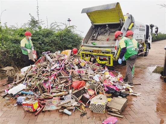 虎门城管分局组织环卫工人清理烟花爆竹垃圾