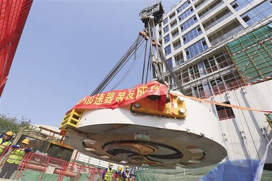 “吊装这个‘大家伙’,可不是筷子夹菜,放进盘子里这么简单。”中建二局项目指挥长郑松介绍,这次选择的履带起重机最大起重量超过400吨,团队在吊装机械位置加装了高达190吨重的超起配重块,反复模拟预演。吊装当天的风速、风向变化都会影响回旋加速器在空中的稳定,为此,吊装时现场8位工作人员手拉牵引绳,力保“大家伙”在高空“稳如泰山”。同时,地面工作人员与吊车司机通过专线通话,确保不受外界信号干扰,实时对接吊装细节,大臂顶部也装有摄像头,确保司机可见地面情况。