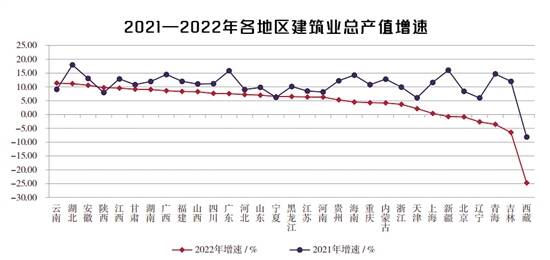 2022年,江苏、浙江、湖北建筑业企业分别以7.63亿平方米、4.49亿平方米和3.33亿平方米位居房屋建筑竣工面积前三位,分别比上年提高1.77%、3.72%和0.45%。广东、湖南、山东、四川、福建、河南、安徽、江西、北京、重庆10个地区的房屋建筑施工面积超过了1亿平方米。12个地区的房屋竣工面积比上年增长,黑龙江以34.32%的增速位居第一;19个地区的房屋建筑竣工面积比上年减少,其中西藏、吉林、青海、宁夏均出现了超过30%的降幅。