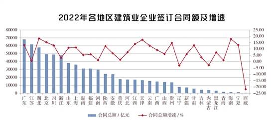 2022年,江苏、广东建筑业企业新签合同额均超过3万亿元,分别达到34033.35亿元和32412.69亿元。新签合同额超过1万亿元的还有湖北、四川、浙江、山东、北京、福建、河南、上海、湖南、陕西、安徽、江西12个地区。新签合同额增速超过10%的有广西、甘肃、江西、湖北、四川、陕西、天津、贵州8个地区,西藏、青海、吉林、辽宁、河南、重庆、江苏、宁夏、浙江9个地区新签合同额出现负增长。