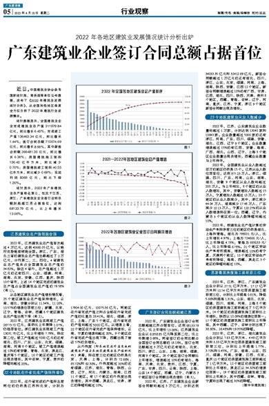统计显示,2022年广东建筑业总产值排名第三,仅次于江苏、浙江;广东建筑业企业签订合同总额则超越江苏占据首位,达到68133.79亿元,比上年增长13.06%。