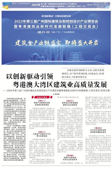为抢抓建筑业发展机遇、促进建筑业高质量发展,“2023年第三届广州国际建筑业和规划设计产业博览会暨粤港建筑业新时代发展联展(工程交易会)”将于2023年8月21日-23日在广州广交会展馆举行,本活动由中央人民政府驻香港特别行政区联络办公室教育科技部、广东省住房和城乡建设厅、香港特别行政区政府发展局、广州市住房和城乡建设局、广州市规划和自然资源局指导,由广州市建筑业联合会主办,由香港建造业议会、香港贸易发展局协同主办。