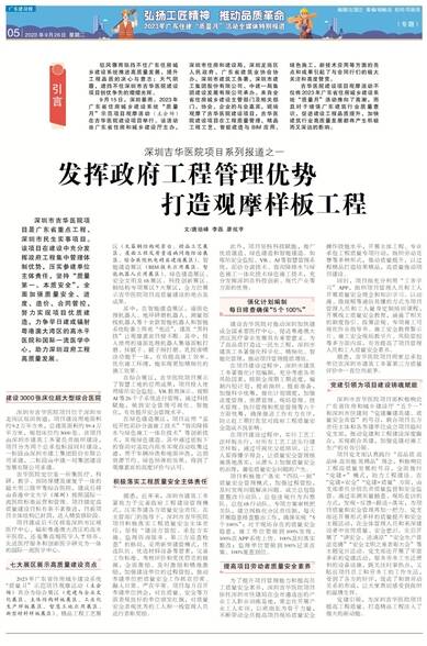 深圳市吉华医院项目是广东省重点工程、深圳市民生实事项目。该项目在建设中充分发挥政府工程集中管理体制优势,压实参建单位主体责任,坚持“质量第一、本质安全”,全面加强质量安全、进度、造价、合同管控,努力实现项目优质建造,力争早日建成辐射粤港澳大湾区的高水平医院和国际一流医学中心,助力深圳政府工程高质量发展。