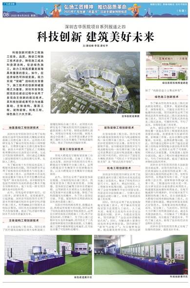 科技创新对提升工程施工效率、品质,推动工程施工技术进步,降低施工成本和资源消耗,促进绿色施工,助力工程高质量发展等具有重要的意义。如今,在追求绿色可持续发展,致力实现“双碳”目标的大背景下,施工技术的创新突破显得尤为重要。深圳市吉华医院项目在建设过程中采用了多项自主创新的前沿技术,其科技创新成果可分为地基基础、主体结构、屋面工程、装饰装修、机电工程、绿色施工六大方面。