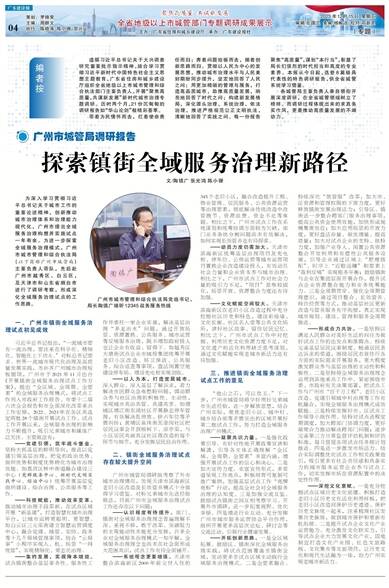 为深入学习贯彻习近平总书记关于城市工作的重要论述精神,创新推动城市治理体系和治理能力现代化,广州市提出全域服务治理构想并实施试点一年有余。为进一步探索全域服务治理模式,广州市城市管理和综合执法局(以下简称广州市城管局)主要负责人带队,先后赴广州市越秀区、白云区,及天津市和山东省烟台市进行了调研考察,形成深化全域服务治理试点的工作思路。
