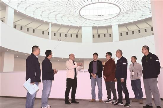市重点项目管理中心负责人邓新勇(左三)在美术馆中庭指导工作 陈欢 摄