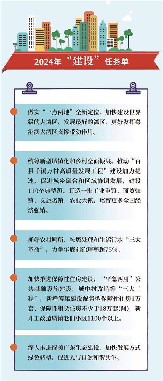 2024年广东提出将完成提升就业服务能力和强化产业技能人才支撑、扎实推进城镇保障性安居工程建设、深入推进“四好农村路”建设和增强高速公路配套基础设施服务能力、加快推进农村和城镇生活污水治理等省十件民生实事。