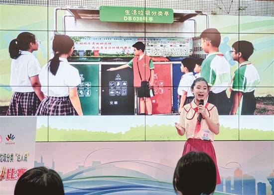 “被塑料缠绕的海龟、被塑料环勒紧的海豹、有害垃圾填埋后难以恢复的土地……这些严重的问题正在我们身边发生。因此,我们小学生更应该践行垃圾分类,守护绿水青山。”来自茂名市电白春华学校的学生吴乐祺,结合自身经历在比赛中畅谈自己对垃圾分类的理解。