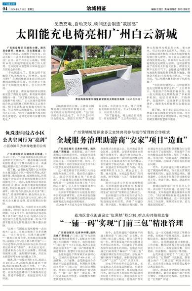 广东建设报讯 记者陈小珊,通讯员全碧芳、伍世柱、王志勇报道:除了能坐下休息,还能给手机充电、自动灭蚊……这样多功能的椅子你坐过没?近日,在广州市白云新城,首批共10张太阳能智能充电椅已投入使用,为市民带来智慧城市和绿色出行方面的全新体验。