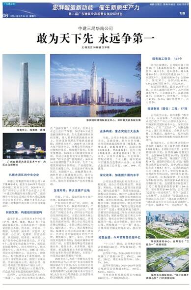 近两年,公司在局改革兴业的统一部署下,结合湾区发展实际情况,在“创新发展”上下功夫,在多元化业态上进行了探索。2022年9月成立基础设施事业部,加大基础设施业务的发展,投入更多资源到线性业务上,同步谋划资源进军地铁或者铁路;深耕重点客户,2022年12月组建大客户服务中心,统筹全司华润客户对接维护体系,精准提升服务;拓宽发展赛道,2023年3月组建安装事业部,形成总承包机电专业管理能力,探索“数字总包”管理模式;2023年10月组建数智工业事业部,负责工业建筑领域的市场开拓、产品线管理、项目实施等工作,后续逐步扩展生物医药、大数据中心、新能源等业务。2023年12月组建海南公司、南沙公司、泉州公司和湛江经理部4个城市公司,强化在重要城市产出的支撑基础。