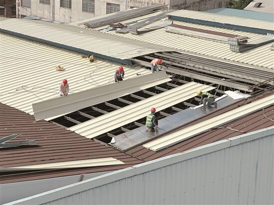 广东建设报讯 记者陈克正、通讯员孔淑贞报道:近日,佛山大道中西侧的海龙产业园,数名工人师傅对一大片铁皮厂房的锈蚀屋顶进行了拆除作业。锈蚀屋顶拆除后,将更换成崭新的太阳能光伏板,这是禅城城管治理铁锈皮屋以来不断探索出来的新方式。
