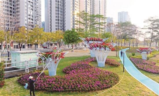 广东建设报讯 记者赵文霞报道:随处可见柱景簕杜鹃,花朵密密地覆盖在枝条上,形成造型花柱;70余种特色花卉,交织呈金红画卷……随着广州花都首座绿美生态共享公园——轻轨公园首期亮相,市民又多了一个春日打卡点。