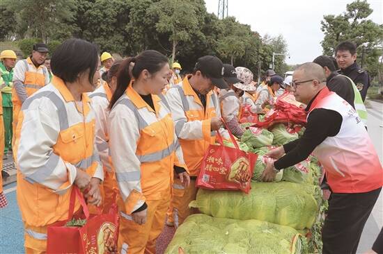 广东建设报讯 记者姜兴贵、通讯员黄泽鹏报道:2月14日,东莞大朗城管分局联合爱心企业东莞市湘阁里辣餐饮管理有限公司,在大朗湿地公园共同开展慰问环卫工人活动,为城市的“美容师”送上约3200斤爱心白菜。