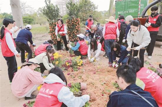 活动现场,领导嘉宾、志愿者与市民代表共同启动了2025年深圳市年花年桔回植工作。在园林工作人员指导下,100余名志愿者和亲子家庭参观了废弃年花年桔分类回收处理的全过程,并积极参与到年花年桔回植的“生命接力”中。志愿者们有序地进行分离“花、盆、泥”工作、挖土刨坑、将经过盆土分离的年花年桔回植到花圃中、填土、浇水……整个过程井然有序,构成一幅生动的环保画卷。
