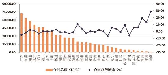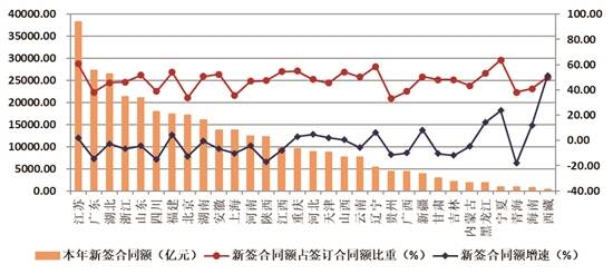 2024年,江苏建筑业企业新签合同额达到38249.48亿元,比上年增长1.88%。新签合同额超过2万亿元的还有广东、湖北、浙江、山东等4个地区。新签合同额增速超过10%的有西藏、宁夏、黑龙江、海南等4个地区,19个地区新签合同额出现负增长,其中青海、陕西、四川新签合同额出现了超过15%的负增长。
