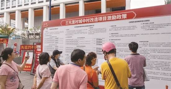 行人正在观看“三元里村城中村改造项目激励政策”大型展板