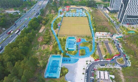 位于广州绕城高速东侧的黄埔全龄智能体育公园,以综合性体育公园建设打造全民健身样板。该公园利用防护绿地,以全龄化和智能化为理念,打造功能齐全、设施完备的生态体育公园,设施涵盖7人足球场、篮球场,乒乓球场、网球场,以及攀岩、吊环、秋千等儿童活动设施、智能健身康体设施、跑道及漫步道等,目前已基本建设完成,将填补周边社区居民长久以来运动休闲空间匮乏的空白。