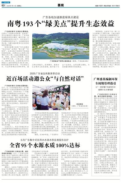 广东建设报讯 记者赵文霞、通讯员粤环宣报道:近日,广东省生态环境部门发布了2025年5月集中式生活饮用水水源水质监测报告,结果显示全省饮用水水源水质总体良好。21个地级以上城市2025年5月开展监测的95个地级以上城市集中式饮用水水源100%达标。