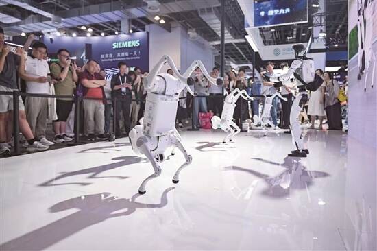 2025世界人工智能大会展览现场,观众与AI机器人互动。(图源:新华社)