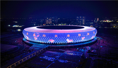 体育场以“裂变荔枝”为设计灵感,建筑外立面呈现如荔枝壳般的独特肌理。白天,银白色幕墙与周边绿植相映成趣,错落有致的菱形结构展现出简约而大气的现代美学。夜晚,智能灯光系统启动,灯光色彩模拟荔枝从青涩到成熟的自然渐变过程,为整座建筑披上一层绚丽而梦幻的“光影外衣”,成为城市中一道夺目的风景。