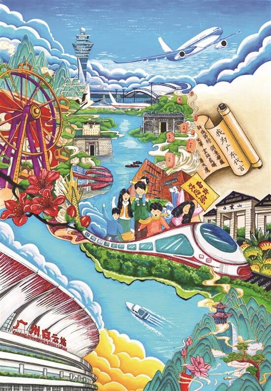 手绘海报一等奖作品《白云新绘·十景画卷》,以明快绚丽的色彩为底,巧妙融合高铁、飞机等现代交通地标,串联起摩天轮、古建筑、山水盛景,木棉盛放、白鹤翱翔于河畔,还有一家人乘高铁时的欢乐互动,搭配“我为广东代言”的卷轴与“白云欢迎您”的标牌,展现出美丽广州的独特魅力。