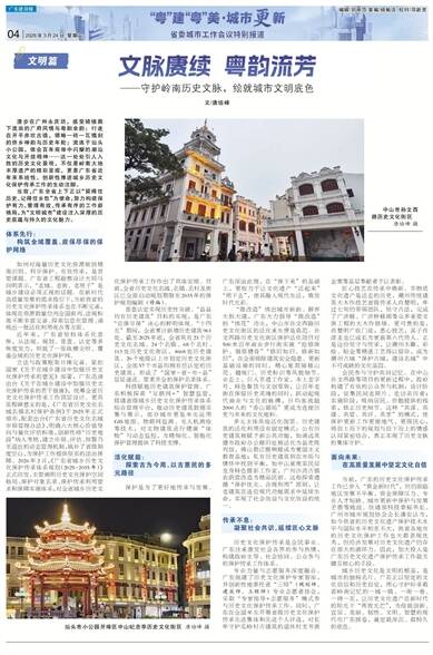 城乡历史文化是文明的根基,是城市的独特名片。广东正以坚定的文化自信和历史自觉,用心守护好承载着岭南记忆的一城一镇、一街一巷、一砖一瓦,让历史文化遗产在新时代的阳光下“再放光芒”,为绘就创新、宜居、美丽、韧性、文明、智慧的现代化广东画卷,奠定最深沉、最持久的底色。
