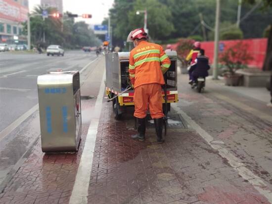 广东建设报讯 记者誉建业、通讯员吴颖诗报道:一阵高压水流扫过,果皮箱四周的油污得到彻底清理……近日,一名环卫工人驾驶一辆崭新的三轮电动高压清洗车出现在佛山禅城祖庙街道,对路边的果皮箱进行快速清洗保洁作业,一阵高压水雾扫过后,果皮箱及地面上积存的污垢迅速褪去,地面焕然一新。 据悉,禅城区环境卫生技术服务中心于今年年初引进了10台三轮电动高压清洗车,对所属保洁管养范围内较多油渍的果皮箱、垃圾桶进行“深度清洁”。此款保洁车与平日常见的人工果皮箱清洗车不同之处在于,环卫工人只需利用车辆自带的高压水枪,对果皮箱及周围路面等保洁范围进行高压冲刷,即可将顽固的油污污渍清除,既减轻人工的清理压力,还能够对果皮箱底部等人工清理困难的部位达到深度清洁,提高了保洁质量,这些新型的高压清洗车投入使用后,将大大提高禅城区道路辅道和人行道作业机械化程度。 这款电动高压清洗车使用方便、体积小、灵活机动,既可洒水又可冲路,并且配备了手持水枪,路面油污、窨井盖、垃圾桶等清洗作业将更加得心应手,其水箱水容量约1立方米,能够保证足够的水量进行日常清洁作业,对比老款人工果皮箱清洗车,它的水箱要大很多,这样可以缩短保洁时间,进一步提高清洗保洁的工作效率,而且,车辆采用的是新能源动力,符合绿色、低碳、环保的发展理念,目前,这种新型环卫设备已开始推广。