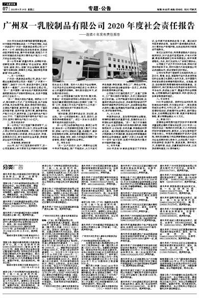 2020年突如其来的新冠疫情笼罩着全球,对中国医疗保障体系是一个严峻的考验,在这一次战疫中广州双一乳胶制品有限公司(以下称双一公司)肩负国企担当临危受命,迅速启动医用物资专线,集中所有资源,短短几个月的时间建设成为医用口罩年生产能力3-4亿只的全自动生产线。 双一公司本着“质量为根本、品牌拓市场、创新促发展、责任创事业”的企业宗旨,秉持“自信、诚信、用心、创新”的企业精神,彰显了“遵守法律法规,保障员工利益,建设绿色和谐家园”的社会责任。 一、 双一公司概况 广州双一乳胶制品有限公司,原名广州广橡企业集团有限公司双一乳胶厂、广州第十一橡胶厂,始创于1955年,前身是中国化工部直属第十一橡胶厂,2014年注册成立现公司。“双一”是中国第一家专业生产乳胶制品和制造乳胶制品生产设备的国有企业,也是中国重点化工企业之一。 “双一”拥有大型生产基地,面积达13万㎡,绿化面积6万㎡,厂区布局合理,生产装备水平高,充分体现节能、高效、绿色环保的理念,主要生产避孕套、家用手套、工业手套、丁基尼龙衬里手套、医用手套、医用口罩,避孕套年生产能力8亿只;家用手套、工业手套年生产能力3000万付;丁基尼龙衬里手套年生产能力350万付;医用口罩年生产能力3.63亿只。 二、 股东权益保护 双一公司在广州工控旗下集团领导下,公司董事会、经营团队同心协力,把社会责任融入到公司的长远发展战略,大力提升经济绩效,兑现对投资人的承诺,把社会进步、和谐、发展视为己任,树立良好的企业形象,持续推进企业的可持续发展。 三、 党建铸魂、诚信经营 2020年,在广州工控党委的领导下,双一公司党委深入学习贯彻习近平新时代中国特色社会主义思想、党的十九届五中全会精神,习近平总书记在深圳经济特区成立40周年大会上的重要讲话精神,强化政治理论学习,切实提升政治站位。 双一公司党委着力发挥“把方向、管大局、保落实”的党组织领导核心和政治核心作用,坚决打赢疫情防控阻击战以及做好“六稳”“六保”工作,党建工作与生产经营中心工作进一步融合,较好地完成了年度各项工作。 四、 共同战疫 “面对疫情,团员青年战必召、召必回、战必胜。”双一公司团委负责人、党员、团员们,自觉取消休假提前返厂,成立一支由20名团员青年组成的战疫突击队。 双一公司工会积极响应市总、集团工会号召,结合双一公司疫情防控及复工复产工作实际,团结一切可以团结的力量,迅速复产,做好防疫物资的采购,有序部署疫情防控工作。并向社会、街道、学校、部队力所能及的捐赠了防疫物资,承担了重要的社会责任。 五、 绿色生态 “双一”从产品设计、生产、消费的全过程中寻求节能途径,推广节能技术;大力开发可再生能源、绿色制造、绿色工厂、绿色出行等,把循环经济的理念渗透到每一名员工,形成良好的氛围和舆论环境。 公司致力于打造花园式工厂,注重厂区绿化,工厂绿化面积不断提升,为员工提供良好的工休环境。公司严格遵守相关法律法规,注重保护周边的生态社区,所有新项目除进行严格的环境影响评估和论证外,还定期检查周边水质和土壤以监测避免污染环境,注重环境绿化,保护生物多样性。 六、 以人为本 和谐劳动关系,是加强和创新社会管理、保障和改善民生的重要内容,是建设社会主义和谐社会的重要基础。“双一”致力于完善政府、工会、企业共同参与的协商协调机制,构建规范有序、公正合理、互利共赢、和谐稳定的劳动关系,最大限度增加劳动关系和谐因素,最大限度减少不和谐因素,促进经济持续健康发展和社会和谐稳定,凝聚广大职工为实现“两个一百年”奋斗目标、实现中华民族伟大复兴的中国梦贡献力量。 七、 伙伴共赢 2020年共有84家供应商签订了环保协议,全年新开发培养供应商19家, 通过走访市场多家供应商,奋战多个昼夜建供应体系,为口罩的生产保驾护航,在供应商来料方面推动节能降本。 我们以实际行动,向消费者提供产品安全使用知识,对产品进行客观宣传,不夸大不欺瞒,帮助消费者树立科学消费理念,保护消费者隐私。为此,我们主动加入广东省打假协会。 公司建立了近万平方米的仓库,拥有大型货车和装卸叉车,同时与国内外其他物流公司达成战略合作,保证货物的及时到达。 公司与世界多个国家和卫生组织机构,以及日化、零售、食品、制造等行业中具有领导地位的企业建立长期深入合作关系。在中国国内所有省份都设有销售和服务网点。在商超、酒店、自动售卖机等零售终端均有较高渗透。互联网时代,我们更率先与世界级的电商和手机平台合作,形成线上线下、覆盖世界的全网销售。公司销售网点已遍布美洲、非洲、欧洲以及东南亚等国家和地区。 八、 社会责任 2020年全国抗疫,政府对企业的扶持,税收减免各种减负,作为国企的双一,更加要肩负起社会责任,今年以来,双一公司时刻关注疫情防控动态,积极履行社会责任,践行国企担当,主动捐赠出医用口罩、乳胶手套等防疫物资,累计捐赠金额达41.5万元。 九、 展望2021 疫情使全球范围内医疗及防护手套的需求量呈现出爆炸式增长的态势,2021年双一公司拟抓住这一难得的历史机遇,引入并研发医疗防护领域新材料、新技术,以安全套和医疗手套为核心,布局形成健康防护系列产品矩阵,将科技