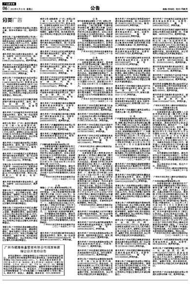 遗失声明 广州冠硕科技有限公司遗失公章、财务专用章各一枚,现声明作废。 减资公告 广东方德贸易有限公司(统一社会信用代码:91440000723831182C)经股东会决议,