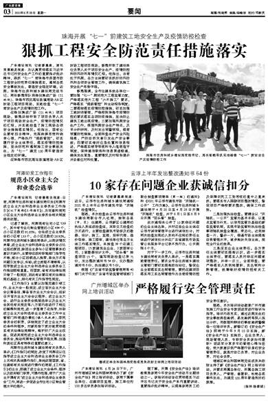 广东建设报讯 记者廖惠康,通讯员黄毅龙报道:为认真贯彻落实习近平总书记对安全生产工作的重要指示批示精神,狠抓“七一”前珠海市房屋市政工程安全防范责任措施落实,