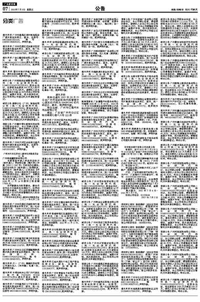 遗失声明 广州市番禺区南村昶海服装厂遗失营业执照正、副本,注册号:440126601252339,编号:S2692014060453G,声明作废。 遗失声明 广州市花都区花东黄志坚百货店遗失营业执照正、副本,统一社会信用代码92440101MA5CTUQF54,注册号440121603367889,声明作废。 遗失声明 广东仁耀投资有限公司,统一社会信用代码:91440803MA51YU1K49,遗失电子营业执照,卡号:30016110141016,现声明作废。 遗失声明 雷州市培兴种植专业合作社,遗失法定名称章一枚,印章编码:4408824135328,现声明作废。 减资公告 广州浩能供应链管理有限公司(统一社会信用代码:91440101MA9UMYBR43)股东会决议,注册资本由原来500万元人民币减少至20万元人民币。请债权人自本公告见报之日起45日内向本公司申报债权,逾期不申报,视为放弃权利,本公司将向公司登记机关申请变更登记。 减资公告 黄榜云仓(广州)物流有限公司(统一社会信用代码:91440101MA5D795J85)股东会决议,注册资本由原来100万元人民币减少至20万元人民币。请债权人自本公告见报之日起45日内向本公司申报债权,逾期不申报,视为放弃权利,本公司将向公司登记机关申请变更登记。 清算公告 广州寰宇博文教育科技有限公司股东会决议,本公司停止经营,清理债权债务。请有关债权人自本公司公告见报之日起45天内,向本公司清算小组申报债权。逾期不申报,视为放弃权利。清算结束后,本公司将向公司登记主管机关申请注销登记。 遗失声明 广州市天河区沙东鸿之盛汽配商行遗失营业执照副本,注册号:440106600843208,编号:06912053897,声明作废。 广州市天河区劳动人事争议仲裁委员会 公 告 广州鸿滋鑫贸易有限公司: 本委受理申请人钟进华诉你方(被申请人)劳动争议案(穗天劳人仲案〔2021〕1267号)已依法作出裁决。因无法与你方(被申请人)取得联系,现向你方(被申请人)公告送达《仲裁裁决书》,自本公告发布之日起经过60天即视为送达。裁决如下:本裁决书生效之日起三日内,被申请人一次性支付申请人2019年10月8日至2020年11月14日期间工资差额17620元。 本仲裁裁决为终局裁决,裁决书自作出之日起发生法律效力。如劳动者不服本裁决,可以自收到本裁决书之日起十五日内向有管辖权的人民法院起诉。特此公告。 广州市天河区劳动人事争议仲裁委员会 二二一年七月二日 遗失声明 广州市花都区花城转角竹窝拉肠店遗失营业执照正本,统一社会信用代码:92440101MA9UWF4J74,编号:GS212020038474,声明作废。 遗失声明 广州市荔湾区烩尔芊小食店遗失营业执照正、副本,注册号440103600909576,统一社会信用代码92440101MA5AEAM41E,声明作废。 遗失声明 广州市荔湾区烩尔芊小食店遗失食品经营许可证正、副本,许可证编号:JY24401030012298,现声明作废。 遗失声明 广州市越秀区璨之屹玩具商行遗失营业执照正副本,统一社会信用代码:92440101MA5ANWM40B,注册号:440104601216789,现声明作废。 遗失声明 广州市白云区同德隆辉鲜果惠水果店遗失营业执照副本,统一社会信用代码:92440101MA5CD85L39,编号:S1192018058392G,声明作废。 遗失声明 天一(广州)健康科技有限公司遗失法人(林伟健)私章一枚,现声明作废。 遗失声明 乍得法纳米公司广州代表处一般代表FANAMI KOLE MOUSTAPHA遗失代表证,编号:91440101671828570W,现声明作废。 遗失声明 广州市越秀区七丁目京星小食店遗失营业执照正、副本,统一社会信用代码92440101MA59K5F53K,注册号440104601014254,声明作废。 遗失声明 广州市番禺区洛浦品南尝北餐厅遗失食品经营许可证正本,许可证编号:JY24401130231969,现声明作废。 遗失声明 广州市番禺区洛浦品南尝北餐厅遗失营业执照正本,统一社会信用代码:92440101MA59KAJ44T,编号:S2692017004970G,声明作废。 遗失声明 徐闻县畅通装卸有限公司,统一社会信用代码:91440825MA4WMFFU53,遗失公章一枚,现声明作废。 减资公告 广州顺旅贸易有限公司(统一社会信用代码:91440101MA5B6RD72B)股东决定,注册资本由原来100万元人民币减少至10万元人民币。请债权人自本公告见报之日起45日内向本公司申报债权,逾期不申报,视为放弃权利,本公司将向公司登记机关申请变更登记。 遗失声明 广州市越秀区贯利水果店遗失营业执照副本,统一社会信用代码:92440101MA59N8Y598,编号:04913010053G,声明作废。 遗失声明 广州丰一科技有限公司遗失公章、财务专用章、法人(卢福洪)私章各一枚,现声明作废。 遗失声明 我单位遗失2007年09月25日由广州市组织机构代码管理中心颁发的代码为664045340的代码证正、副本,现声明作废。 单位名称:广州市亿强汽车用品有限公司 地址:广东省广州市白云区陈田南街七巷十六号102房 遗失声明 广州市亿强汽车用品有限公司遗失营业执照正、副本,注册号:4401112015815,现声明作废。 遗失声明 广州市亿强汽车用品有限公司遗失国、地税税务登记证正、副本,税号:440111664045340,现声明作废。 遗失声明 广州市亿强汽车用品有限公司公章、财务专用章、法人(刘美凤)私章各一枚,现声明作废。 遗失声明 广州市越秀区龙汐百货店遗失营业执照正本,统一社会信用代码:92440101MA9W2H6U34,编号:GS042020048010,声明作废。 清算公告 广州市珍芙伊贸易有限公司股东决定,自2021年7月2日起,本公司停止经营,清理债权债务。请有关债权人自本公司公告见报之日起45天内,向本公司清算小组申报债权。逾期不申报,视为放弃权利。清算结束后,本公司将向公司登记主管机关申请