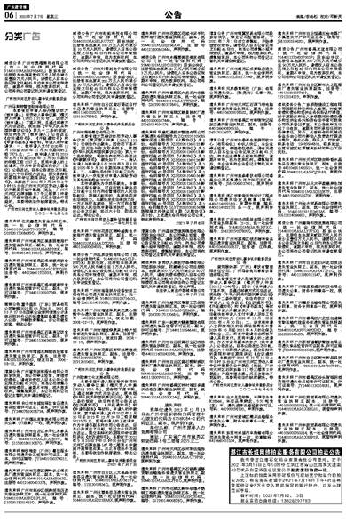 减资公告 广州市奥楷展柜有限公司(统一社会信用代码:91440101MA5APM642L)股东决定,注册资本由原来壹佰万元人民币减少至壹拾万元人民币。请债权人自本公告见报之日起45日内向本公司申报债权,逾期不申报,视为放弃权利,本公司将向公司登记机关申请变更登记。 广州市天河区劳动人事争议仲裁委员会 公 告 广州马斯特管理咨询有限公司: 本委受理申请人杨丹煌诉你方(被申请人)的劳动人事争议案(穗天劳人仲案〔2021〕2190号),因你方(被申请人)下落不明,且通过邮寄方式无法送达,现依据《中华人民共和国民事诉讼法》第九十二条的规定,依法向你方(被申请人)公告送达《应诉通知书》、《开庭通知书》和《申请书副本》等材料。申请人的仲裁请求:一、被申请人支付2020年11月1日至2020年11月30日期间的工资7475元;二、被申请人支付2019年8月1日至2020年11月30日期间的年假工资1557元。现将申请人的上述请求,作为申请书副本向你方(单位)公告送达。自本公告发出之日起,经过六十日即视为送达。提交答辩状的期限和举证期限详见《应诉通知书》。本案定于2021年9月24日上午9时15分在广州市天河区劳动人事争议仲裁委员会仲裁庭(地址:广州市天河区石牌东路117号三楼第2仲裁庭)开庭审理此案。无正当理由不到庭的,本委将依法作缺席裁决。特此公告。 广州市天河区劳动人事争议仲裁委员会 二二一年七月七日 遗失声明 江荣鑫遗失营业执照正本,统一社会信用代码:92440101MA59T09XXW,编号:S0392017008649G,声明作废。 遗失声明 广州市越秀区美嘉眼镜商行遗失营业执照正、副本,统一社会信用代码:92440101MA5A8E920K,编号:S0492014011046G,声明作废。 遗失声明 广州市番禺区洛浦暖湘饮食店遗失营业执照正、副本,统一社会信用代码:92440101MA5CE70Q5P,注册号:440126601975928,声明作废。 遗失声明 广州市番禺区洛浦暖湘饮食店遗失食品经营许可证正、副本,许可证编号:JY24401130507748,现声明作废。 撤销公告 量子盛放(广东)贸易有限公司撤销2021年03月26日、2021年03月27日在国家企业信用信息公示系统分别对外公示的清算组备案及债权人公告,并解散清算组。该公司继续经营,特此公告! 遗失声明 广州市番禺区石基南记饮食店遗失食品经营许可证正、副本,许可证编号:JY24401130696929,现声明作废。 遗失声明 广州市增城杰辉钢板经营部遗失营业执照正、副本,注册号:440125321006162,核发日期:2006-08-22,声明作废。 清算公告 广州富荣装卸服务有限公司股东决定,本公司停止经营,清理债权债务。请有关债权人自本公司公告见报之日起45天内,向本公司清算小组申报债权。逾期不申报,视为放弃权利。清算结束后,本公司将向公司登记主管机关申请注销登记。 遗失声明 台山市台城建强饮食店遗失食品经营许可证正、副本,许可证编号:JY24407810038794,现声明作废。 遗失声明 广州德运发物流有限公司遗失公章(行政章)一枚,现声明作废。 遗失声明 广州市白云区永平仁木家具店遗失营业执照副本,统一社会信用代码:92440101MA5ARA9D3Y,编号:S1192018013087G,声明作废。 遗失声明 鲜饮唯劲(广州)餐饮服务有限公司遗失食品经营许可证正、副本,许可证编号:JY24401050374211,现声明作废。 遗失声明 广州市花都区狮岭沃必得皮具厂遗失营业执照正、副本,统一社会信用代码92440101MA5A6B26XL,注册号440121600403378,声明作废。 遗失声明 广州市南沙区胡涛胡商店遗失营业执照正本,统一社会信用代码:92440101MA5BDRPL1H,编号:S1092018021433G,声明作废。 减资公告 广州市松拓科技有限公司(统一社会信用代码:91440101MA5BLRU727)股东决定,注册资本由原来100万元人民币减少至10万元人民币。请债权人自本公告见报之日起45日内向本公司申报债权,逾期不申报,视为放弃权利,本公司将向公司登记机关申请变更登记。 减资公告 广州市时诺刻电子有限公司(统一社会信用代码:91440104593722366M)股东会决议,注册资本由原来200万元人民币减少至30万元人民币。请债权人自本公告见报之日起45日内向本公司申报债权,逾期不申报,视为放弃权利,本公司将向公司登记机关申请变更登记。 遗失声明 广州市白云区黄石诺迈自行车店遗失营业执照正本,注册号:440111601025733,编号:11913017898G,声明作废。 广州市天河区劳动人事争议仲裁委员会 公 告 广州市晟焰餐饮有限公司: 本委受理方艺凝诉你司劳动人事争议案(穗天劳人仲案〔2021〕153号)已依法作出裁决。因你司下落不明,因无法与你方取得联系,根据《中华人民共和国民事诉讼法》第九十二条的规定,现依法向你司公告送达《仲裁裁决书》,裁决如下:一、确认申请人与被申请人在2018年9月6日至2020年9月30日期间存在劳动关系;二、本裁决书生效之日起三日内,被申请人一次性支付申请人解除劳动关系经济补偿金20000元。 本仲裁裁决为非终局裁决。当事人如不服本裁决,可自收到本裁决书之日起十五日内向有管辖权的人民法院起诉;期满不起诉的,本裁决即发生法律效力。本裁决发生法律效力后,一方不执行本裁决,另一方可向有管辖权的人民法院申请强制执行。自发出公告之日起,经过六十日,即视为送达。特此公告。 广州市天河区劳动人事争议仲裁员会 二二一年七月七日 遗失声明 广州市花都区狮岭越衡电子称商行遗失营业执照正、副本,统一社会信用代码92440101MA5AAD9D93,注册号440121600694995,声明作废。 减资公告 广州泓