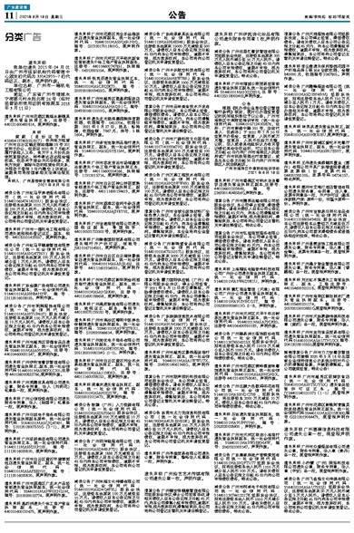 遗失声明 我单位遗失2015年04月01日由广州市组织机构代码管理中心颁发的代码为33142955-7的代码证正、副本,现声明作废。 单位名称:广州市一德机电工程有限公司 地址:广东省广州市增城永宁街蒌元村永胜北街26号(临时经营场所使用证明有效期至2018年3月11日) 遗失声明 广州市花都区雅瑶永新模具厂遗失营业执照正本,注册号:440121600489814,现声明作废。 声 明 黄毅(身份证号码:432424197405251817):你向我方租赁广州市白云区鹤龙街启德路28号201室用于办公,但您自2021年7月起不履行承租人义务,我方于8月份先后使用直接送达、邮件寄达送达租金催收函,但您未予理会并无法联系。现我方决定:解除与您的租赁合同关系,并限您于登报3日内腾空上诉地址,逾期我司将按国家相关法律法规处理。 声明人:广州星恒物业管理有限公司 2021年8月16日 减资公告 广州红马甲养老服务有限公司(统一社会信用代码:91440106347414210U)股东会决议,注册资本由原来1010万元人民币减少至100万元人民币。请债权人自本公告见报之日起45日内向本公司申报债权,逾期不申报,视为放弃权利,本公司将向公司登记机关申请变更登记。 遗失声明 广州市一德机电工程有限公司遗失地税税务登记证正、副本,税号:440183331429557,现声明作废。 减资公告 广州红马甲健康管理有限责任公司(统一社会信用代码:91440101MA59Q4T95Y)股东会决议,注册资本由原来100万元人民币减少至1万元人民币。请债权人自本公告见报之日起45日内向本公司申报债权,逾期不申报,视为放弃权利,本公司将向公司登记机关申请变更登记。 遗失声明 广东金捷广告有限公司遗失营业执照副本,统一社会信用代码:91440101MA59H84N2W,编号:S2112016018025,声明作废。 减资公告 广州市明辉服饰有限公司(统一社会信用代码:91440101MA59TUP627)股东决定,注册资本由原来100万元人民币减少至10万元人民币。请债权人自本公告见报之日起45日内向本公司申报债权,逾期不申报,视为放弃权利,本公司将向公司登记机关申请变更登记。 遗失声明 广州市越秀区贤德食品店遗失营业执照正副本,统一社会信用代码:92440101MA5A99PJ3G,注册号:440104600091547,现声明作废。 遗失声明 广州伊和宫餐饮管理有限公司遗失营业执照正、副本,统一社会信用代码91440101MA59KPXCX0,注册号440126000823786,现声明作废。 遗失声明 广州熙腾皮具有限公司遗失公章、财务专用章、法人(刘莉花)私章各一枚,现声明作废。 遗失声明 广州公信投资有限公司遗失财务专用章、法人(杨国平)私章各一枚,现声明作废。 遗失声明 广州日妲电子商务有限公司遗失营业执照副本原件,统一社会信用代码:91440101MA5CJQ474N,编号:S1012018007593G(2-1),现声明作废。 遗失声明 广州玖玥美容有限公司遗失营业执照正本,统一社会信用代码:91440111MA59DXP12B,编号:S1112016020820,现声明作废。 遗失声明 广州市白云区黄石怀塘雪面包店遗失营业执照正、副本,统一社会信用代码:92440101MA5AFEEN21,编号:S1112016020820,现声明作废。 遗失声明 广州市荔湾区广龙水产品经营部遗失营业执照副本,统一社会信用代码:92440101MA9W0XNL0M,编号:S032020032774,现声明作废。 遗失声明 高烈洲遗失个体工商户营业执照副本,注册号:440103600193675,现声明作废。 遗失声明 广州市花都区秀全乐益桶装水店遗失营业执照副本,统一社会信用代码:92440101MA59Q6RN2Q,编号:S2192017011803G,现声明作废。 遗失声明 广州市天河区天平彬庆副食经营部遗失个体工商户营业执照副本,注册号:440106600747851,执照编号:06912005154,现声明作废。 遗失声明 张秀芬遗失营业执照正本,统一社会信用代码:92440101MA5CBDJK73,编号:S0392018009455G,现声明作废。 遗失声明 广州市越秀区堡基莉服装店遗失营业执照副本,统一社会信用代码:92440101MA5AHAQR1C,编号:S0492016013103G,现声明作废。 遗失声明 遗失龙光珑滨嘉园购房首期收据,收据编号:0453706,收据日期:2021年2月27日,姓名:彭艳梅,收据金额:7867元,房号:5栋1604。声明作废。 遗失声明 广州多宠宠物用品商行遗失营业执照正、副本,统一社会信用代码:91440101MA5D5YE15M,现声明作废。 遗失声明 广州市容发货运市场福鑫货运部遗失个体工商户营业执照正本,注册号:440115600034166,执照编号:11913015716,现声明作废。 遗失声明 广州市白云区神山钟丽要熟食档遗失个体工商户营业执照正、副本,注册号:440111600194619,现声明作废。 遗失声明 广州市荔湾区俊利牛杂店遗失营业执照正、副本,统一社会信用代码:92440101MA5AJN8Y02,现声明作废。 遗失声明 广州宝涵商贸有限公司遗失国税证副本,粤国税字:440100593723502号,现声明作废。 遗失声明 广州御傲国际贸易有限公司遗失银行开户许可证,核准号:J5810167104501,现声明作废。 遗失声明 广州市白云区白云湖林景美食店遗失营业执照副本,统一社会信用代码:92440101MA5ARJR65J,注册号:440111601956033,现声明作废。 遗失声明 广州市花都区新华明金利酒类商行遗失营业执照正、副本,统一社会信用代码:92440101MA5A2G2K60,注册号:440121600188658,现声明作废。 遗失声明 广州禺邦物流有限公司遗失国、地税证正、副本,粤税字:440100070195181号,现声明作废。 遗失声明 广州市南沙区靖明中医养生保健馆遗失营业执照副本,统一社会信用代码:92440101MA9W2J7BX1,编号:S102020066634,现声明作废。 遗失声明 广州旅优电子商务有限公司遗失营业执照副本,统一社会信用代码:91440101MA59K