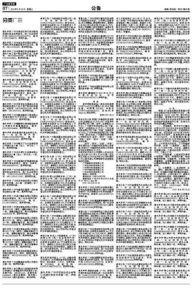 遗失声明 广州市南沙区珠江照光猪肉档遗失营业执照副本,统一社会信用代码92440101MA59X35F7G,编号S102019064574,声明作废。 遗失声明 广州市旭达劳务服务有限