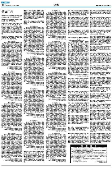 遗失声明 广州哥芬香精香料科技有限公司遗失公章一枚,现声明作废。 遗失声明 广州市浪域科技有限公司遗失公章一枚,现声明作废。 减资公告 广州元宇昌贸易有限公司(统一社会信用代码:91440101327606346N)股东会决议,注册资本由原来303万元人民币减少至100万元人民币。请债权人自本公告见报之日起45日内向本公司申报债权,逾期不申报,视为放弃权利,本公司将向公司登记机关申请变更登记。 遗失声明 广州腾晖供应链管理有限公司遗失公章、财务专用章、私章(罗升升)各一枚,现声明作废。 吸收合并公告 兹有广州龙顺汽车租赁有限公司(简称甲)吸收合并广州佳际汽车租赁有限公司(简称乙)。双方的股东决定,甲拟吸收合并乙,合并完成后,甲尚继续存续,乙将注销。合并前甲的注册资本为1000万元人民币,乙的注册资本为50万元人民币。合并后存续的甲注册资本金不变,仍为1000万元人民币。根据有关法律规定,合并各公司的债权债务均由合并后存续的甲承继,请合并各公司的债权人(“债权人”)自收到通知书之日起三十日内,未收到通知书的自本次公告之日起四十五日内,可凭有效债权凭证要求公司清偿债务或提供像样担保。债权人未在规定期限内行使上述权利的,吸收合并将按照法定程序实施。特此公告。联系人:殷春梅,联系电话:15800000586。 广州龙顺汽车租赁有限公司 广州佳际汽车租赁有限公司 2021年10月01日 吸收合并公告 兹有广州市君尚汽车服务有限公司(简称甲)吸收合并广州市君尚合二汽车租赁有限公司(简称乙)。双方的股东决定,甲拟吸收合并乙,合并完成后,甲尚继续存续,乙将注销。合并前甲的注册资本为200万元人民币,乙的注册资本为10万元人民币。合并后存续的甲注册资本不变,仍为200万元人民币。根据有关法律规定,合并各公司的债权债务均由合并后存续的甲承继,请合并各公司的债权人(“债权人”)自收到通知书之日起三十日内,未收到通知书的自本次公告之日起四十五日内,可凭有效债权凭证要求公司清偿债务或提供像样担保。债权人未在规定期限内行使上述权利的,吸收合并将按照法定程序实施。特此公告。联系人:罗岳峰,联系电话:13688882600。 广州市君尚汽车服务有限公司 广州市君尚合二汽车租赁有限公司 2021年10月01日 吸收合并公告 兹有广州市君尚汽车服务有限公司(简称甲)吸收合并广州市君尚合三汽车租赁有限公司(简称乙)。双方的股东决定,甲拟吸收合并乙,合并完成后,甲尚继续存续,乙将注销。合并前甲的注册资本为200万元人民币,乙的注册资本为10万元人民币。合并后存续的甲注册资本不变,仍为200万元人民币。根据有关法律规定,合并各公司的债权债务均由合并后存续的甲承继,请合并各公司的债权人(“债权人”)自收到通知书之日起三十日内,未收到通知书的自本次公告之日起四十五日内,可凭有效债权凭证要求公司清偿债务或提供像样担保。债权人未在规定期限内行使上述权利的,吸收合并将按照法定程序实施。特此公告。联系人:罗岳峰,联系电话:13688882600。 广州市君尚汽车服务有限公司 广州市君尚合三汽车租赁有限公司 2021年10月01日 吸收合并公告 兹有广州市君尚汽车服务有限公司(简称甲)吸收合并广州市君尚合四汽车租赁有限公司(简称乙)。双方的股东决定,甲拟吸收合并乙,合并完成后,甲尚继续存续,乙将注销。合并前甲的注册资本为200万元人民币,乙的注册资本为10万元人民币。合并后存续的甲注册资本不变,仍为200万元人民币。根据有关法律规定,合并各公司的债权债务均由合并后存续的甲承继,请合并各公司的债权人(“债权人”)自收到通知书之日起三十日内,未收到通知书的自本次公告之日起四十五日内,可凭有效债权凭证要求公司清偿债务或提供像样担保。债权人未在规定期限内行使上述权利的,吸收合并将按照法定程序实施。特此公告。联系人:罗岳峰,联系电话:13688882600。 广州市君尚汽车服务有限公司 广州市君尚合四汽车租赁有限公司 2021年10月01日 清算公告 广州市金锋体育器械有限公司股东会决议,本公司停止经营,清理债权债务。请债权人自本公司公告见报之日起45天内,向本公司清算小组申报债权。逾期不申报,视为放弃权利。清算结束后,本公司将向公司登记主管机关申请注销登记。 遗失声明 广州植越生物科技有限公司遗失公章、财务专用章各一枚,现声明作废。 吸收合并公告 兹有广州市君尚汽车服务有限公司(简称甲)吸收合并广州市君尚合五汽车租赁有限公司(简称乙)。双方的股东决定,甲拟吸收合并乙,合并完成后,甲尚继续存续,乙将注销。合并前甲的注册资本为200万元人民币,乙的注册资本为10万元人民币。合并后存续的甲注册资本不变,仍为200万元人民币。根据有关法律规定,合并各公司的债权债务均由合并后存续的甲承继,请合并各公司的债权人(“债权人”)自收到通知书之日起三十日内,未收到通知书的自本次公告之日起四十五日内,可凭有效债权凭证要求公司清偿债务或提供像样担保。债权人未在规定期限内行使上述权利的,吸收合并将按照法定程序实施。特此公告。联系人:罗岳峰,联系电话:13688882600。 广州市君尚汽车服务有限公司 广州市君尚合五汽车租赁有限公司 2021年10月01日 吸收合并公告 兹有广州市君尚汽车服务有限公司(简称甲)吸收合并广州市君尚合六汽