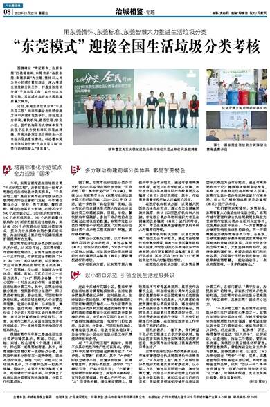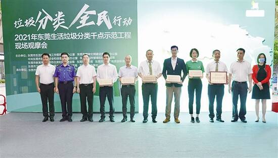 围绕建设“湾区都市、品质东莞”的战略目标,东莞市以“品质东莞、幸福家园”为主题,坚持以人民为中心的城市管理理念,深入推进生活垃圾分类工作,打造生活垃圾分类“千点示范工程”,以小切口示范引领,实现城市品质和人居环境质量大提升。 近日,东莞生活垃圾分类“千点示范工程”现场观摩会在东城街道万科中天城市花园举行。活动现场为学校、餐饮机构、酒店住宿、物业小区、医疗机构等五大领域单位代表授予垃圾分类标准化示范点牌匾,并实地参观垃圾分类物业小区市级示范点建设情况,标志着东莞市生活垃圾分类“千点示范工程”攻坚行动全面驶入“快车道”。 A 培育标准化示范试点 全力迎接“国考” 今年,东莞全面推进生活垃圾分类“千点示范工程”,力争打造出一批有示范效应的生活垃圾分类实施点。“千点示范工程”是由东莞市生活垃圾分类办联同相关行业主管部门发起,今年将在物业小区、学校、医疗机构、餐饮机构、酒店住宿等五大板块,打造不少于500个示范级小区、200间示范级学校、100个示范级医院、500个示范级餐饮机构和100间示范级酒店住宿机构,共计超1000个示范级生活垃圾分类实施点,更加充分发挥条块结合模式的优势,为生活垃圾分类示范片区建设提质扩面提供有力支撑。 据东莞市生活垃圾分类办副主任胡孔齐介绍,从2020年起,在东莞市委、市政府高位推动下,东莞市全面启动第一个三年行动,初步划定全市按照“3+3”和“1+1”的区块布局,以及围绕八大应用场景推进生活垃圾分类实施。“3+3”即莞城、松山湖、滨海湾为全面试点,南城、东城、万江的三分之一社区为试点,“1+1”即其余各镇一个中心区和一个村为试点的布局,全面铺开生活垃圾分类工作。其中,东莞生活垃圾分类统一按照国标四分法进行,即分类成有害垃圾、厨余垃圾、可回收物和其他垃圾。试点区域也按照八个主要应用场景,包括公共机构、公共场所、集贸市场、医疗机构、餐饮机构、学校、企业(办公区)和居住区进行系统化布局,并分别设置标准化分类指引。当前,东莞市已被列入全国生活垃圾分类考核城市,下一步将用国考标准进行考核和排名。 根据东莞市今年第二季度生活垃圾分类评估情况显示,莞城、万江、南城、东城、松山湖等5个街道(园区)中,排名第一的是莞城街道。其中,滨海湾新区目前仅有一栋综合办公楼,按照指标体系分析存在一定特殊性,因此不进行评分。根据“1+1”示范片区评估结果显示,28个镇排名第一的是凤岗镇。整体上,东莞市大部分镇街(园区)的成绩处于中等水平,初步建立了生活垃圾分类制度和设施保障,分类工作初显成效。 B 多方联动构建前端分类体系 彰显东莞特色 据了解,东莞市生活垃圾分类办印发的《2021年东莞生活垃圾分类“千点示范工程”集中攻坚行动工作方案》,是继2020年东莞市出台《东莞市生活垃圾分类三年行动方案(2020-2022年)》之后,进一步按照“典型引路”策略,在全市以示范点建设形式深入推进生活垃圾分类工作落地实施。目前,学校、餐饮机构申报踊跃,参加千点示范的点位已超过此前设定的数量。东莞市垃圾分类办将对每个示范点颁发“东莞生活垃圾分类千点示范工程实施点”牌匾,实行建档管理。 在物业小区板块方面,以万科中天城市花园为全市示范点,通过各镇街(园区)垃圾分类办推荐,500多个居民小区纳入创建。市垃圾分类办年底将组织对市住建局及各镇街(园区)履职情况进行双考核。 在学校板块方面,以东莞市第六高级中学为全市示范点,通过市教育局集中推荐,超过200所学校纳入创建。市垃圾分类办年底将组织对市教育局及各镇街(园区)进行双考核,其中,市教育局直管学校不纳入对镇街的考核。 在医疗机构板块方面,以莞城人民医院为全市示范点,通过市卫生健康局集中推荐,共计102间医疗机构纳入创建。市垃圾分类办年底将组织对市卫生健康局及各镇街(园区)进行双考核,其中,市卫生健康局直管医疗机构不纳入对镇街的考核。 在餐饮机构板块方面,以星巴克海德广场店为全市示范点,通过市连锁餐饮协会集中推荐,共有500多间餐饮机构纳入创建。市垃圾分类办年底将组织对市商务局、市市场监管局及各镇街(园区)进行双考核,其中,不在“3+3”和“1+1”范围的点位不纳入对镇街的考核。 在酒店住宿板块方面,以东莞会展国际大酒店为全市示范点,通过市商务局和市文化广播旅游体育局联合推荐,共有100多家酒店住宿机构纳入创建。东莞市垃圾分类办年底将组织对市商务局、市文化广播旅游体育局及各镇街(园区)进行双考核。 “我们要用东莞情怀、东莞标准、东莞智慧大力推进生活垃圾分类。”东莞市城市管理和综合执法局副局长陈世光受东莞市垃圾分类办主任刘永定委托,在观摩会发言中表示:“一方面需要全力做好后端收处体系的建设,另一方面需要全力做好前端分类引导,各系统、各领域围绕目标最终构建成东莞特色和谐有序的前端分类体系。在生活垃圾分类这件大事上,大家坚持同向而行,坚持全城和谐有序,希望各级各部门和社会各界,乃至每个市民的坚定配合,积极奉献东莞智慧,一起动脑动手,一点点克服困难,一步步爬越高山。” C 以小切口示范 引领全民生活垃圾共识 走进中天城市花园小区,整洁有序的生活垃圾分类智能投放点、生活垃圾分类效果楼栋公