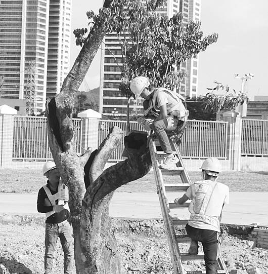 工人对古树的树洞进行处理 唐培峰 摄 |