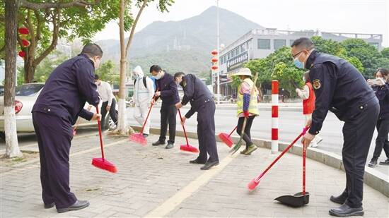 樟木头城管人员和防疫、环卫工人一同清扫街道 |
