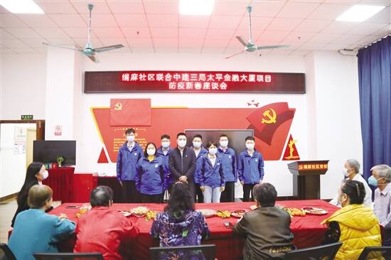 广东建设报讯 记者誉建业,通讯员王梓嘉、张玲报道:1月7日,中建三局广州太平金融大厦项目党支部、五矿长岭居项目党支部联合天河区员村街道绢麻社区党支部举办防疫新春座谈会。员村街道绢麻社区书记范红梅、社区下属10个网格支部书记,以及来自太平项目、长岭居项目的党员、青年职工代表共19人参加座谈。 本次座谈会围绕从社区到工地的疫情防控及安全等话题展开讨论,旨在更好地了解双方防疫措施,完善项目管理,为安全生产提供更好的保障。 中建三局广州太平金融大厦项目经理陈智丽向社区介绍了项目基本情况,就项目在防疫宣传、人员管理、物资采购、环境消杀、数据上报、体温监测等方面的做法与社区深入交流,并对绢麻社区在疫情防控、疫苗接种等方面的工作表示大力支持。 范红梅肯定了中建三局在疫情防控过程中的努力和成果,赞扬中建三局展现出的央企担当和社会责任。双方通过交流加深彼此了解,为社企联动、共同抗击疫情贡献积极力量。 据了解,中建三局广州太平金融大厦项目自开工以来,严格按照政府及公司要求落实疫情防控工作。为减少暴露风险,项目部租赁大巴车每日往返于项目部生活区和工地接送工友,以实际行动践行央企责任担当,切实发挥央企顶梁柱作用,为社区疫情防控贡献积极力量。