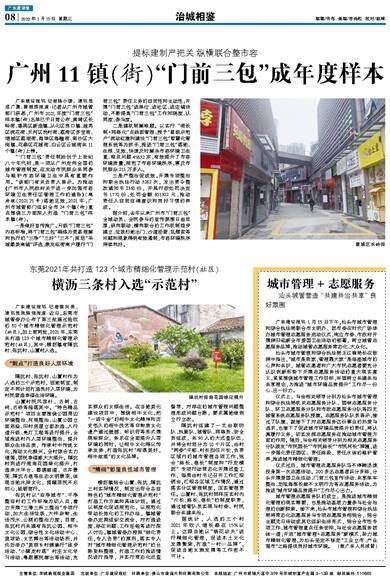广东建设报讯 记者陈小珊,通讯员成广聚、黄瑶烨报道:记者从广州市城管部门获悉,广州市2021年度“门前三包”样本镇(街)名单已于日前公布,黄埔区长岭街、番禺区新造镇、从化区良口镇、越秀