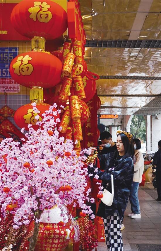 图/文 广东建设报记者 杨榆洁 新年逛花街,行大运,是属于广州人的独特年味。受疫情的影响,广州今年暂停了传统迎春花市活动,这让不少街坊抱怨年味少了。年味变淡了吗?其实不然,看看这,年味一直都在…… 记者从地铁一德路站出来,成排的骑楼下是一间连一间的商铺,不管是珍馐海鲜还是平常食材,精品饰品还是儿童玩具,更有一间又一间的新年装饰店,把一德路装饰得红红火火,让前来扫货的街坊们提前感受到了春节的喜悦,充满着对新春的期待…… 熙熙攘攘的人流,拥堵的车流,还夹杂着店家的叫卖声、卸货货箱撞到地面的砰砰声、拉货小铁车经过发出的啦啦声……这是101岁一德路的专属繁华。 这火热的氛围,与一德路百年前人声鼎沸的贸易交流可是一脉相承的。最初,这里被称为“三栏”,即“果栏”“鱼栏”“菜栏”。到了民国,广州汲取西方敞廊式建筑的特征,并与中国内地传统的檐廊式建筑形式相融合,一座座骑楼在道路两旁拔地而起,行成别具一格的街道景观,人在其中活动能够不受车辆干扰,广州特色的骑楼商业街最早便始于此处。而广州雨水多、天气热,骑楼的“遮风雨、防日晒”具有了天然的优越性,为行街的老广遮阴纳凉。 走在一德路上,这边的爷爷奶奶正在挑海味,品种繁多让人挑花眼;那边的小姐姐在挑对联,这烫金的、毛笔的、植绒的、刺绣的,都是中国人迎接春节的仪式感……人们手上一袋又一袋,大包小包满载而归。 年味在哪?一德路,就是一种年味……