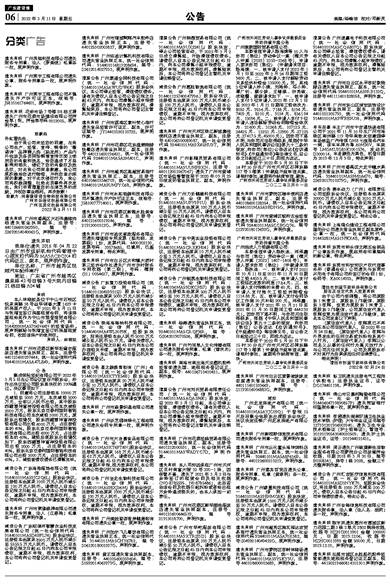 遗失声明 广州英铭科技有限公司遗失财务专用章、法人(罗美桃)私章各一枚,现声明作废。 遗失声明 广州熙宇工程有限公司遗失公章、财务专用章各一枚,现声明作废。 遗失声明 广州熙宇工程有限公司不慎遗失开户许可证正本,核准号:J5810161764601,现声明作废。 遗失声明 花侨市场7号楼B8档王珊遗失广州市花都市场建设有限公司押金单1张,押金单号码0012005,现声明作废。 致歉函 孙红雷先生: 由于我公司未经您的同意,在我公司生产、经营、宣传、销售的“薇诺诗”品牌懒人洗(染发剂)产品内外包装及各类网络销售宣传页面上使用您的肖像和姓名,给您造成了不良影响和损失,侵犯了您的肖像权及姓名权,对此我公司深表歉意。我公司现积极给您进行赔偿,并向您表示深深的歉意。对于此次侵权行为,我公司将积极调整,杜绝此类事件再次发生。我们非常尊重您的在演艺界的成就,并祝您事业顺利。再次致歉! 致歉方:河南薇诺诗生物科技有限公司 广州市采洁化妆品有限公司 广州圣发化妆品有限公司 2022年3月11日 遗失声明 广州市番禺区大石伟廉猪肉档遗失营业执照副本,注册号:440126600262950,编号:S2692014040063G,声明作废。 遗失声明 我单位遗失2016年04月22日由广州市组织机构代码管理中心颁发的代码为MA5ACEQX4的代码证正、副本,现声明作废。 单位名称:广州市越秀区悦顺汽车配件商行 地址:广东省广州市越秀区濂泉路42号自编3号大院内自编21栋自编A04铺 声明 本人林晓姣是位于中山市石岐区悦来南路38号益华领峯大厦1629卡的房屋产权人,于2021年8月15日与张增宜签订房屋租赁合同,将该房屋租给其作为中山市楚登商贸有限公司,统一社会信用代码:91442000MA5706N64N的经营场所。现声明解除与张增宜签订的房屋租赁合同,收回该房产的使用权。 声明人:林晓姣 遗失声明 广州市花都区新华粉黛尔服装店遗失营业执照正、副本,注册号440121600297444,统一社会信用代码92440101MA5A47LE49,声明作废。 公 告 集成保险经纪有限公司于2022年3月5日在公司会议室召开股东会,所作出决议经公司股东表决权的100%通过。决议事项如下: 1、同意将公司注册资本10000万元减资至5000万元,本次减资5000万元,全部以人民币出资。其中股东西藏雪坤富神投资有限公司本次减资2000万元,股东北京泛泰柯国际智能科技有限公司本次减资3000万元。原股东出资情况:股东西藏雪坤富神投资有限公司出资4000万元,占注册资本的40%。股东北京泛泰柯国际智能科技有限公司出资6000万元,占注册资本的60%。减资后现股东出资情况如下:股东西藏雪坤富神投资有限公司出资2000万元,占注册资本的40%。股东北京泛泰柯国际智能科技有限公司出资3000万元,占注册资本的60%。2、减资前债权债务已清算完毕。 减资公告 广东海珍服饰有限公司(统一社会信用代码:91440101MA59JC2Q6L)股东会决议,注册资本由原来1000万元人民币减少至100万元人民币。请债权人自本公告见报之日起45日内向本公司申报债权,逾期不申报,视为放弃权利,本公司将向公司登记机关申请变更登记。 遗失声明 广州市聚缘棋牌有限公司遗失财务专用章、法人(江春艳)私章各一枚,现声明作废。 减资公告 广东绍演河智慧农业科技发展有限公司(统一社会信用代码:91440101MA5D4BFL74)股东会决议,注册资本由原来8500万元人民币减少至5555.5万元人民币。请债权人自本公告见报之日起45日内向本公司申报债权,逾期不申报,视为放弃权利,本公司将向公司登记机关申请变更登记。 遗失声明 广州市增城啊辉汽车配件店遗失营业执照正本,注册号:440125302003827,现声明作废。 遗失声明 广州佑迪计算机科技有限公司遗失营业执照正本,统一社会信用代码:914401016813208694,编号:S2612014027933,现声明作废。 清算公告 广州渠道全网科技有限公司(统一社会信用代码:91440101MA5AWUDW6K)股东会决议,本公司停止经营,清理债权债务。请有关债权人自本公司公告见报之日起45天内,向本公司清算小组申报债权。逾期不申报,视为放弃权利。清算结束后,本公司将向公司登记主管机关申请注销登记。 遗失声明 广州市荔湾区素叶梵心商行遗失食品经营许可证正、副本,许可证编号:JY14401030310722,现声明作废。 遗失声明 广州市花都区花东盛燃烧腊快餐店遗失营业执照正、副本,注册号440121600196421,统一社会信用代码92440101MA5A2M401C,声明作废。 遗失声明 广州市越秀区高越贸易商行遗失营业执照正、副本,注册号440104603346709,统一社会信用代码92440101MA9UMFYC68,声明作废。 遗失声明 广州市永拓能源科技有限公司不慎遗失开户许可证正本,核准号:J5810077714001,现声明作废。 遗失声明 广州市花都区新雅木胜美食店遗失营业执照正本,注册号:440121600319246,编号:21913000312G,声明作废。 遗失声明 广州市迪优家政服务有限公司遗失增值税专用发票(抵扣联、发票联)1份,发票代码:4400202130,发票号码:39578685,已填用,已盖发票专用章,特此声明。 遗失声明 广州市白云区太和镇大沥村第三经济合作社遗失广州市农村财务专用收据(第二联),号码:穗财(21)0054627,现声明作废。 减资公告 广东复力投资有限公司(统一社会信用代码:91440101304599315J)股东会决议,注册资本由原来5000万元人民币减少至50万元人民币。请债权人自本公告见报之日起45日内向本公司申报债权,逾期不申报,视为放弃权利,本公司将向公司登记机关申请变更登记。 