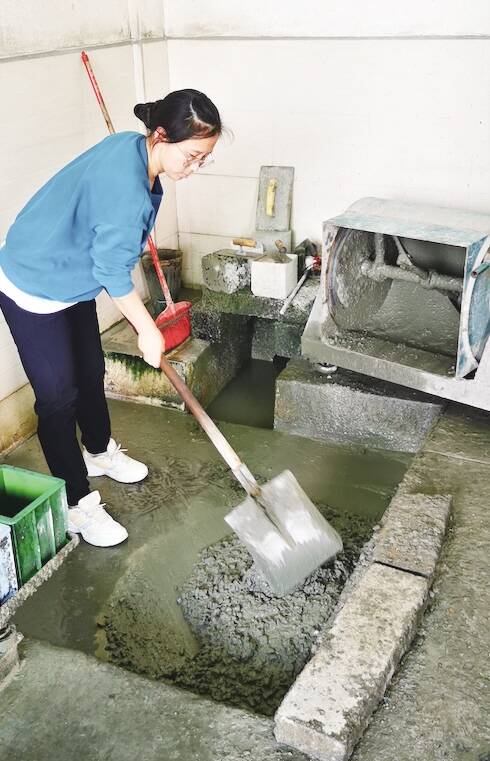 杨俊燕正在对混凝土配合比进行试验 |