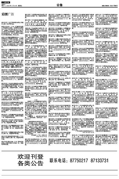 遗失声明 广州可平特贸易有限公司遗失公章一枚,声明作废。 减资公告 润口(广东)环境科技有限公司经股东会决定,注册资本由原来2000万元人民币减少至500万元人民币。请债权人