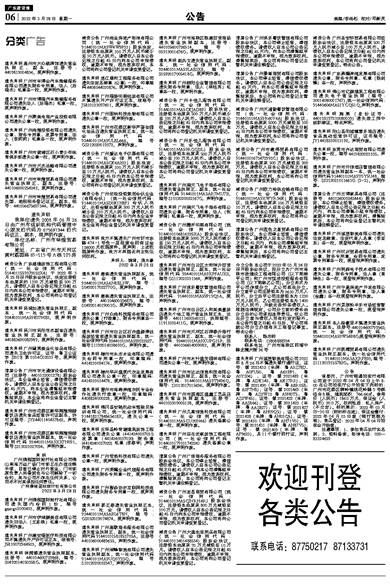 遗失声明 高州市大众棋牌馆遗失营业执照正、副本,注册号:4409813004836,现声明作废。 遗失声明 广州市车博会汽车维修服务有限公司遗失财务专用章、法人(后瑞杰)私章